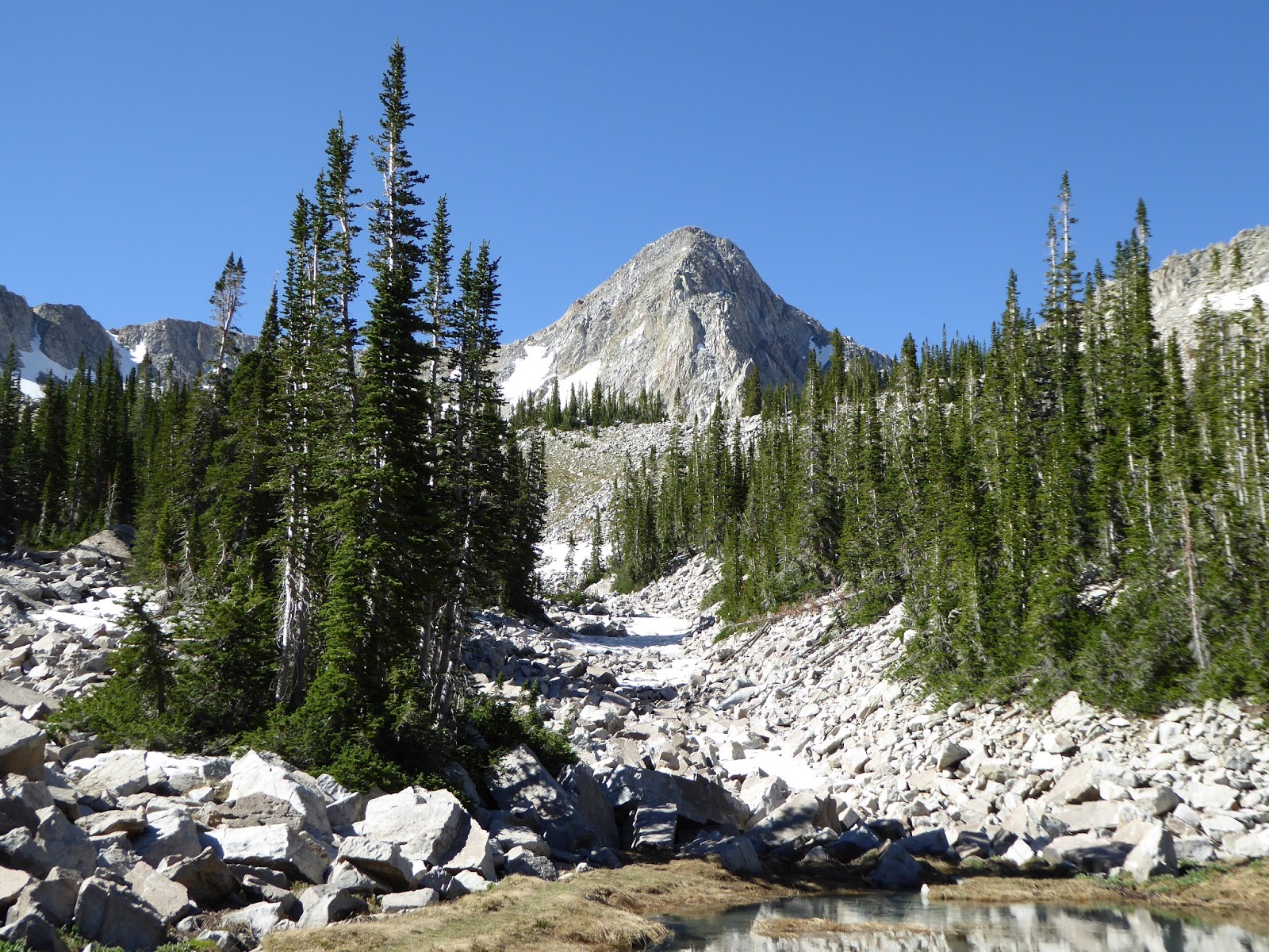 We scrambled up the side of a short bowl, stepping rock to rock cautiously as many of the smaller ones would shift under our feet. We got to the lip of the bowl, finding a great view of the little lakes below us, then picked our way through some pines and across some lingering snow to the far side of the bowl. Our descent down the bowl was a little quicker since we were able to glissade down some snow before hopping back onto the boulders.