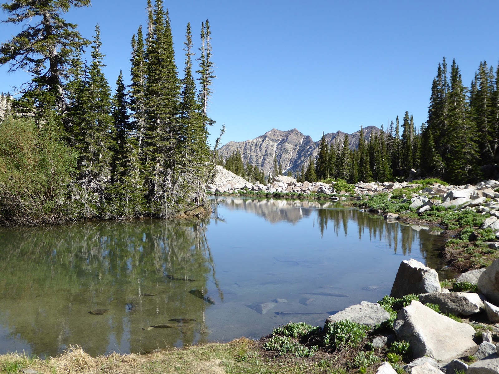 We started at 7:45 a.m., at which point the parking lot was already full; we were the first to park out on the canyon road and four other cars pulled in behind us by the time we hit the trail. The first section is the old road, wide and even but rocky, climbing steadily up to the junction where the White Pine and Red Pine trails split. There were a few other hikers starting when we did, much younger than we are and with backpacks and good footwear, so we opted to let them get by us. We turned off onto the trail to Red Pine Lake which is narrower than the White Pine trail. The Red Pine trail climbs steadily, steeply in some spots, almost entirely shaded. The trail is a little rocky and in spots we had to walk in some water due to some seasonal runoff.